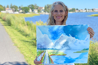 My paintings are known for vibrant color and luminous light. Through layering and blending, I embrace watercolor’s translucency to create depth and atmosphere, often exploring the interplay of light and shadow. Rooted in a realistic style, my work celebrates details, mood, and the poetry of everyday moments. Many pieces begin with my own photography and capture scenes ranging from New England landscapes to my native France. Watercolor’s balance of control and spontaneity continues to shape and mirror my artistic journey.